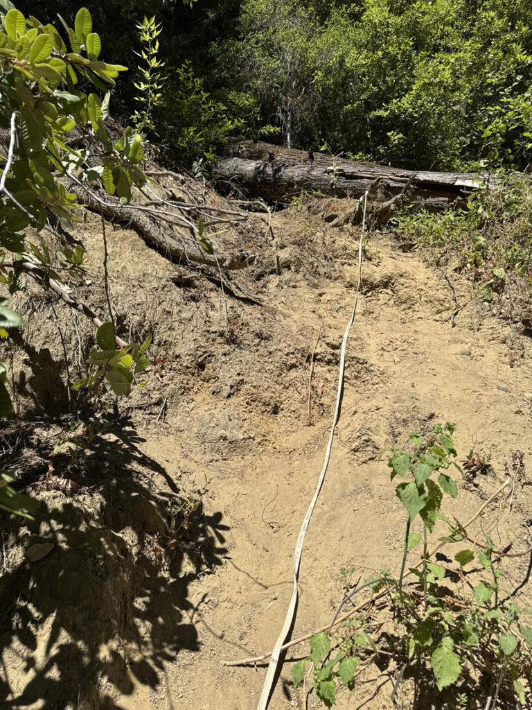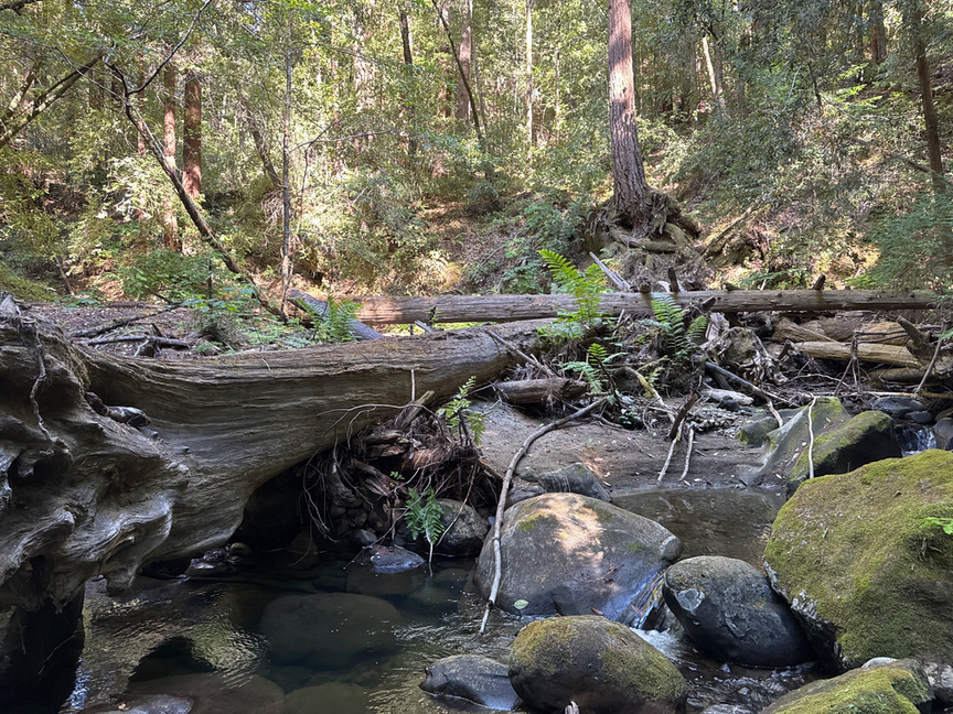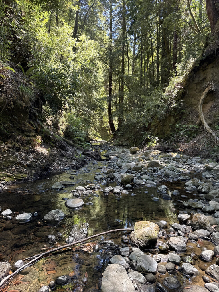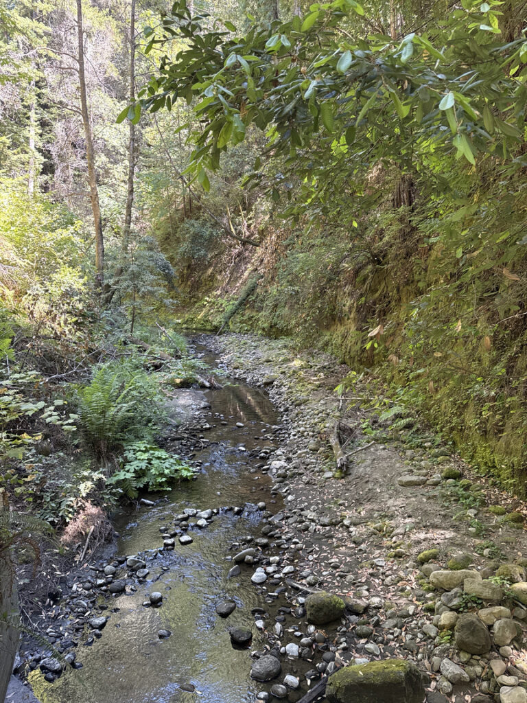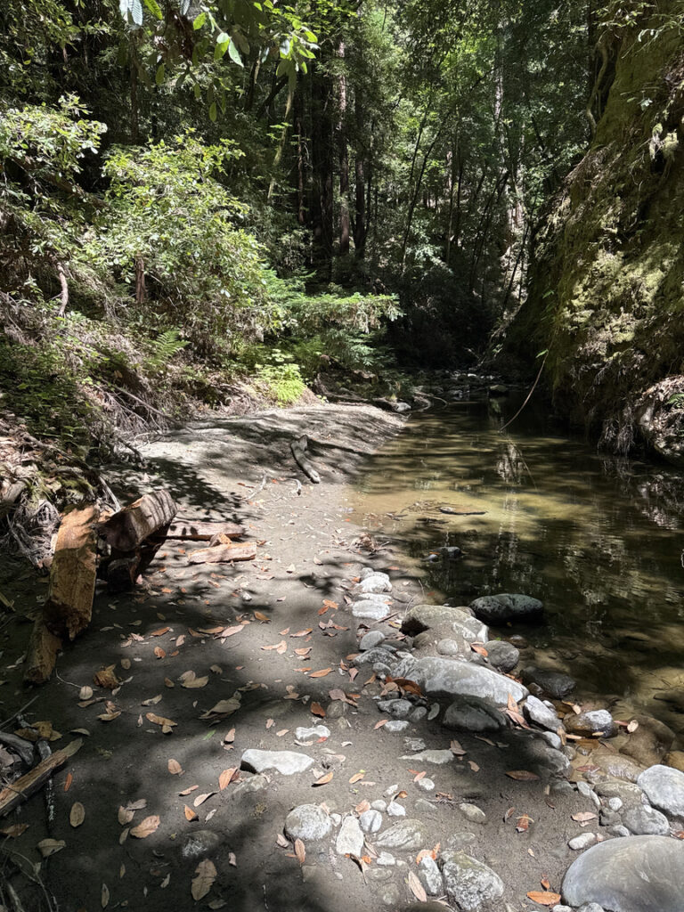 I later learned that there had been some small tectonic events — slippages — and also a few large storms that dumped enormous amounts of water in the hills, and these had made the area unstable and in many places impassable. The creek itself didn’t look too bad, though, and the water level was low, so I decided to just follow the creek up to the site.
