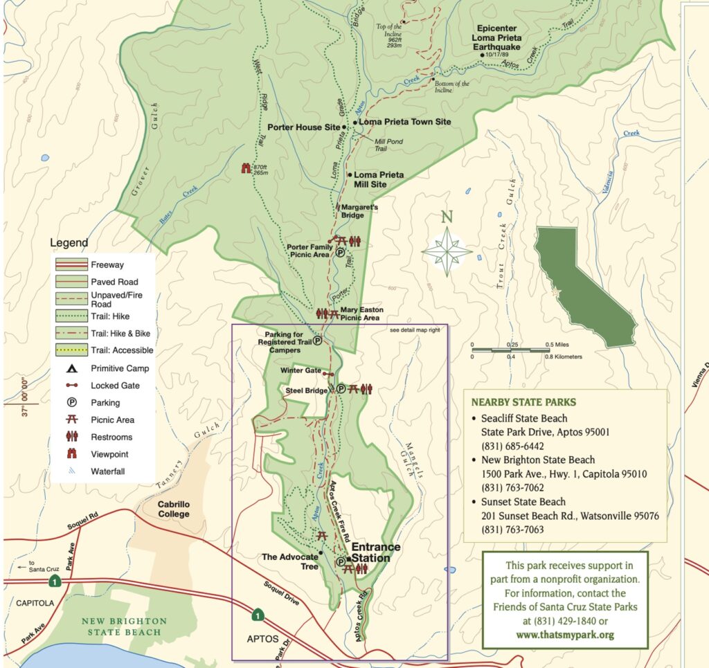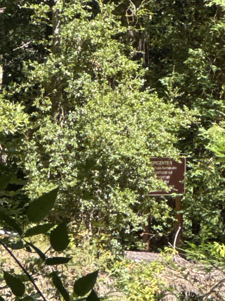 I usually try to pick something interesting to see when I visit a park, and here at Nisene Marks what interested me was a memorial at the site of the 1989 Loma Prieta earthquake’s 6.9 epicenter. The San Andreas fault runs just northeast of the park, and the Zayante spur crosses Aptos Creek. The site is about 6.5 miles from the park entrance.
