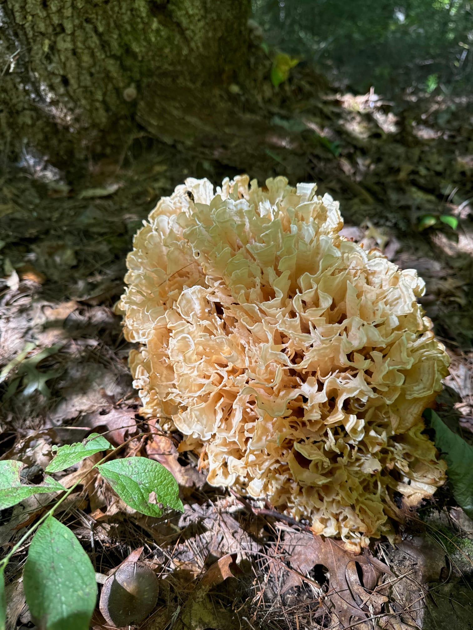 I activated US-4704 Franklin State Forest, Massachusetts, today. It’s an old-growth New England hardwood forest with some pockets of very old pine. An 8-mile off-road trail is built into the hear of the forest, which makes trekking pretty easy. I chose Magotty Hill at about 370 feet as my site, and it was about a 1.5 mile hike in. The trails are lovely and relatively flat until you get around the hill. I spotted an Eastern Cauliflower mushroom a bit off the path, the first I’d ever seen, and I do a lot of mushrooming in these parts. They are quite tasty and I thought about taking this one for dinner. Since I’ve only seen just this one, though, I decided to let it be. I tasted a few fronds, which were delicious. I marked the spot and will check back next season. I’ve already scored three Sulfur Shelf mushrooms on POTA trips this year…it’s mushrooming time in New England!