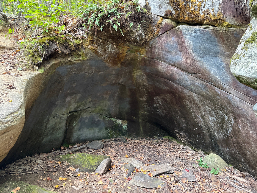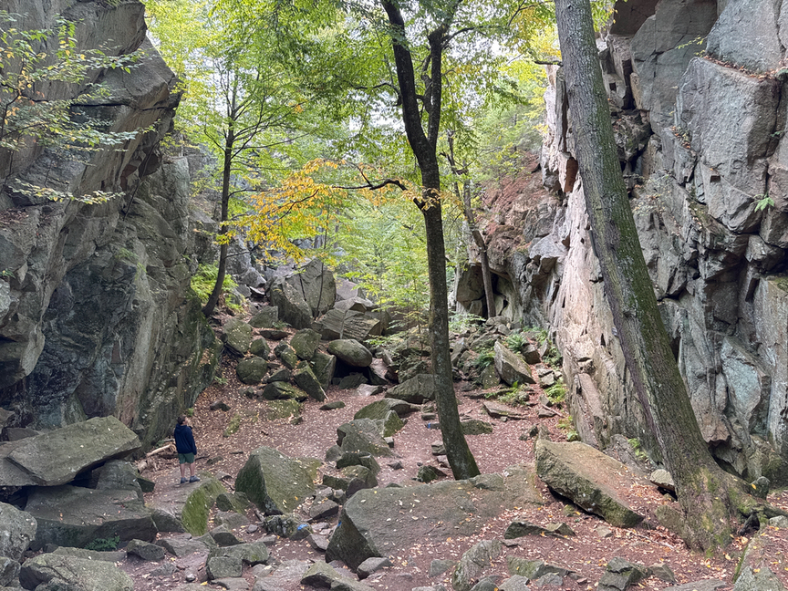 It’s a short walk along a well-marked trail through the Chasm itself. This section is where you’ll run into quite a few casual walkers, especially families with kids, and also a lot of dogs. On nice days you’ll see rock climbers walking through to one of the several popular spots out in the forest, especially in the area called Little Purgatory. Climbing is specifically prohibited in the Chasm itself. I should note that the trails that run along the top of the cliffs around the Chasm can be very slippery, and just recently someone fell to their death.