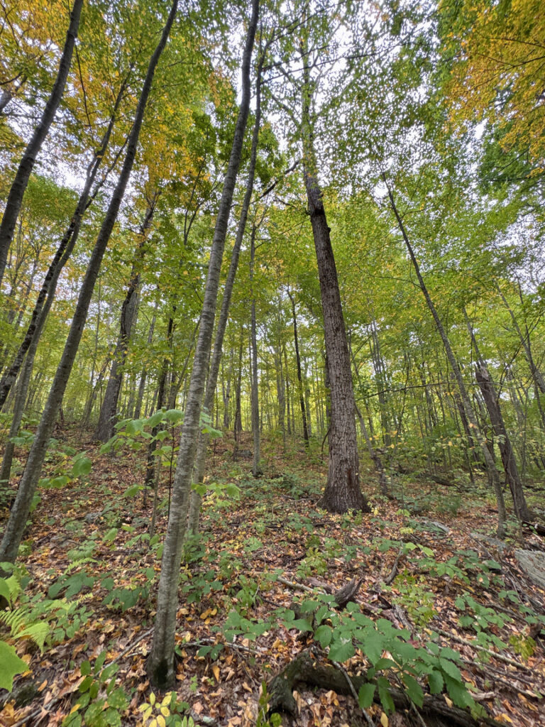 Walking back out of the park, I noticed something really interesting about the forest. For the most part the trees were birch, and most of them were what I’d call medium-sized, maybe 20 to 30 feet tall.. Occasionally there’d be a really large hardwood, maple or oak, standing dead or on the ground, and then all around, almost like ground cover, striped maple saplings.