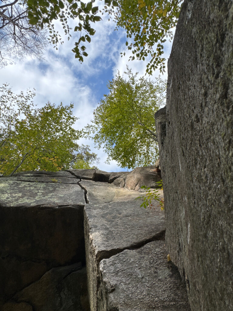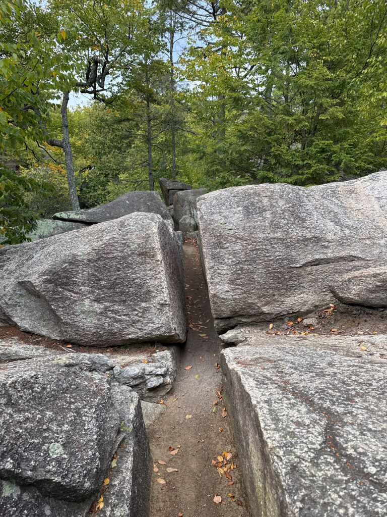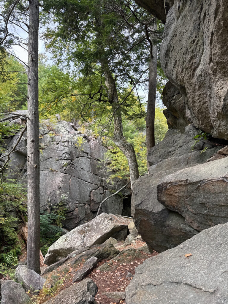 There are other ways to get into the forest, of course, with both small road cutouts and larger more official parking areas ringing the property, but honestly, if you are driving all the way to Sutton, Massachusetts, you would be poorer for the experience if you don’t get there through Purgatory. There are two large parking areas, both near the entrance to the Chasm. A Visitor’s Center is in the lower lot, and it also hosts a playground, gardens, a pavilion, and a large number of picnic tables. An accessible viewing area, with a ramp, of the Chasm is nearby. Parking in 2025 is $5, payable at an electronic kiosk.