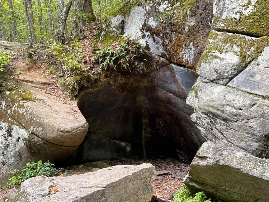 One more fun bit of nature, this time just at the edge of the Chasm, technically outside the forest but interesting nonetheless. To get there, on your way back from Sutton Forest — it’s a trail that leads right to the Chasm — hang a right when you come to the first wooden footbridge. This takes you up and to the east of the Chasm, so you can look down into it. A similar trail runs on the west side, but I think the east is more interesting. This is a geologist’s playground, but I’ll just pass along one fun thing to look at.