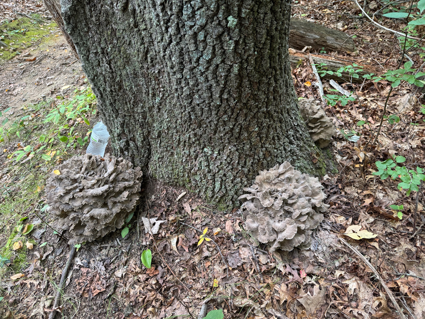 For sulphurs, trim the tips, about two inches or so back, and sauté them with butter until browned a bit. Toss some truffle salt on there and dig in! You’ll also find Hen-Of-the-Woods this time of year, they look like ruffled birds sitting at the base of oaks. Here’s one for reference from US-8383 Wrentham State Forest. There are three hens here.