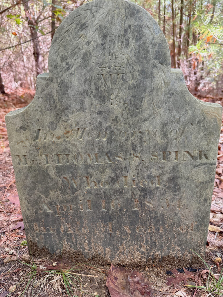 This is the Thomas Spink plot. Thomas died young in 1834 at just 30, and his stone is the only one that has visible markings — it is made of slate, traditional at the time and readily quarried in the area. His stone had been removed by the 1970s according to contemporary reports, but it was returned in 2006 by a gentleman who had come into possession of the marker but didn’t know where it belonged. The nine other markers are smaller and made of granite, quarried not far away. They are heavily eroded and no engravings are visible on any of them.