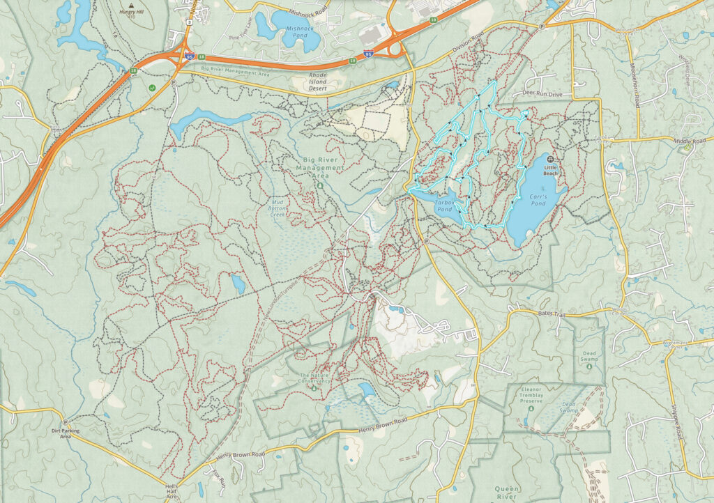 The map is zoomed out far enough that the crazy web of trails that criss-cross the park isn’t visible. Big River is a magnet for dirt bikes, and the RI NEMBA (New England Mountain Bike Association) spends a lot of time and effort out here to maintain hundreds of tiny trails. I quickly realized that it wasn’t going to be possible to check the map at every intersection because I could practically see the next intersection from the one I was standing in. Instead, I took a look at the terrain on the topo map, decided roughly where I wanted to activate from, noted where the sun was in that direction, and then just hiked, keeping the sun in more or less the right spot.